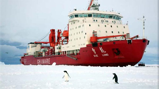 Tàu phá băng Xuelong của Trung Quốc cùng đoàn thám hiểm đang tiến hành các hoạt động khảo sát và chuẩn bị xây dựng trạm nghiên cứu thứ 5 trên lụa địa băng. Xuelong hiện là tàu phá băng duy nhất của Trung Quốc. (Ảnh: People's Daily)